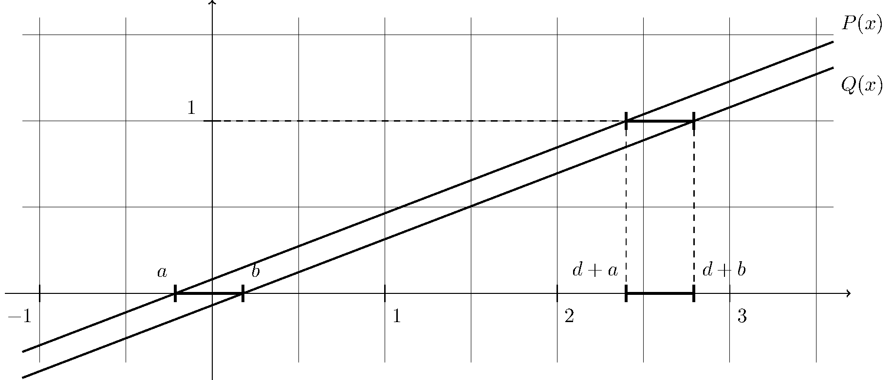 Repeating this argument, the regions in which \(\lfloor P(x) \rfloor \gt \lfloor Q(x) \rfloor\) are given by the equally spaced intervals \(I_m := [md + a, md + b)\) for any \(m \in \mathbb Z\), though we will only care for values of \(m\) with \(m \geq 1\). The first intervals of these form are, approximately