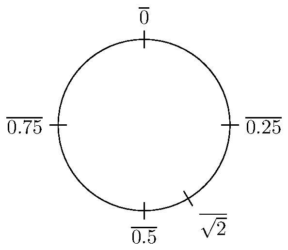 We can visualize what happens with every translation of these intervals by working in the circle group, that is, the real numbers modulo the integers \(\mathbb{R} / \mathbb{Z}\). This simply means discarding the integer part of the numbers we are working with and looking at their decimals. For example, if we want to look at \(\sqrt 2 \approx 1.4142\) in the circle group, it will be at the same place as \(0.4142\dots\), while every integer will be in the same place as \(0\). We will denote this decimal part of a number \(x \in \mathbb R\) as \(\overline x \in \mathbb R / \mathbb Z\). We can visualize this like this: