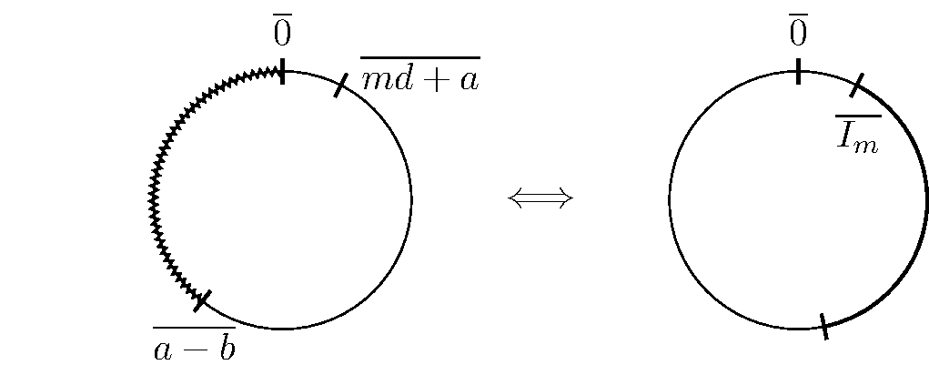 Obviously, \(I_m\) will contain an integer \(n\) if if \(md + a \leq n \lt md + b\). Since \(b = a + (b-a)\), this means that \(I_m\) will contain \(n\) if and only if \(md + a \leq n\) and \(md + a \gt n - (b-a)\), that is, if \(md + a \in (n - (b-a), n]\). In the unit circle, this is equivalent to \(\overline{md + a} \in \left(\overline {a-b}, \overline 0\right]\), that is, that the left side of \(\overline I_m\) is between \(\overline{a-b}\) and \(\overline 0\) (this might feel ambiguous since there's no ordering in the unit circle and "between two numbers" could mean anything, but hopefully the illustrations convey clearly what this means). Notice that \(a-b\) is a constant and its decimal part is approximately \(0.606780\). This way, instead of asking whether \(\overline 0\) is contained in \(\overline I_m\), we will ask if \(\overline{md+a} \in \left( \overline{a-b}, \overline 0\right]\), which is somewhat easier.