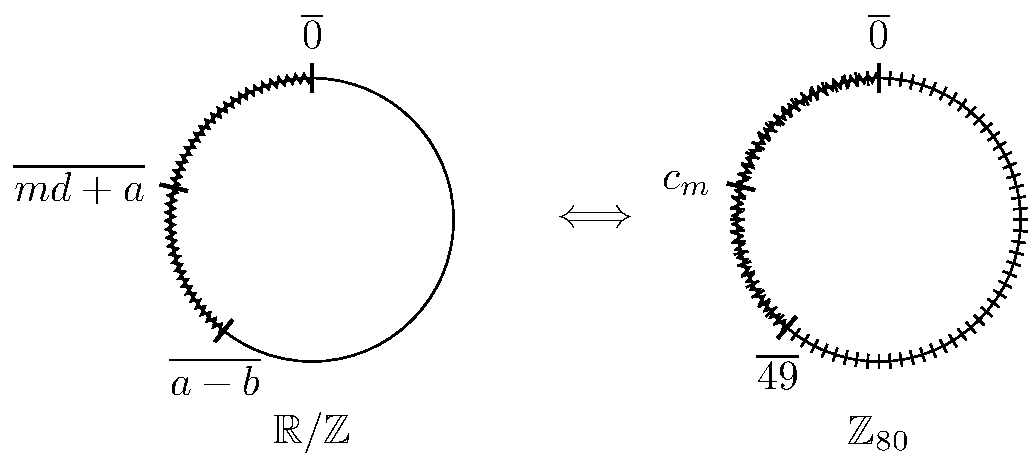 In the unit circle, we have \(\overline d \approx \overline{\frac{49}{80}}\) and \(\overline a \approx \overline{\frac{63}{80}}\), so that \(\overline{md+a} \approx \overline{\frac{49}{80} m - \frac{17}{80}}\). Notice that this means that \(\overline{md+a}\) is always falling in the subdivisions made by dividing the circle in \(80\) parts. This suggests that we can replace our faithful unit circle with an \(80\)-element cyclic group, like the integers modulo \(80\), \(\mathbb Z_{80} := \mathbb Z / 80 \mathbb Z = \left\{ \overline 0, \overline 1, \dots, \overline{79} \right\}\). This way, we associate \(I_m\) and \(\overline{md+a} \approx \overline{\frac{49}{80} m - \frac{17}{80}} \in \mathbb R / \mathbb Z\) with \(c_m := \overline {49 m - 17} \in \mathbb Z_{80}\).